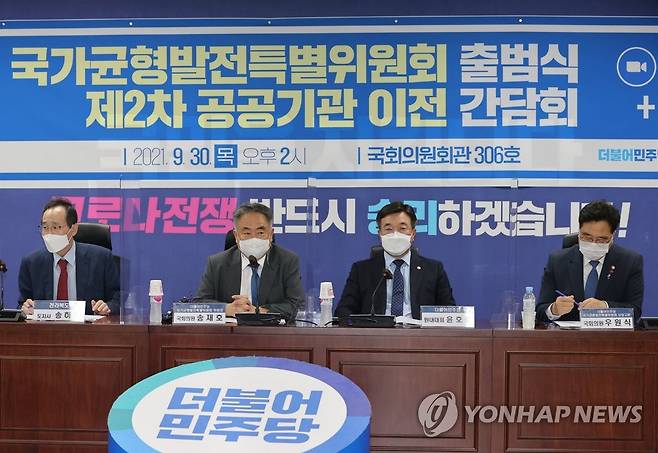 (서울=연합뉴스) 하사헌 기자 = 더불어민주당 송재호 국가균형발전특별위원장이 30일 서울 여의도 국회의원회관에서 열린 국가균형발전특별위원회 출범식 및 제2차 공공기관 이전 간담회에서 환영사를 하고 있다. 2021.9.30 [국회사진기자단]