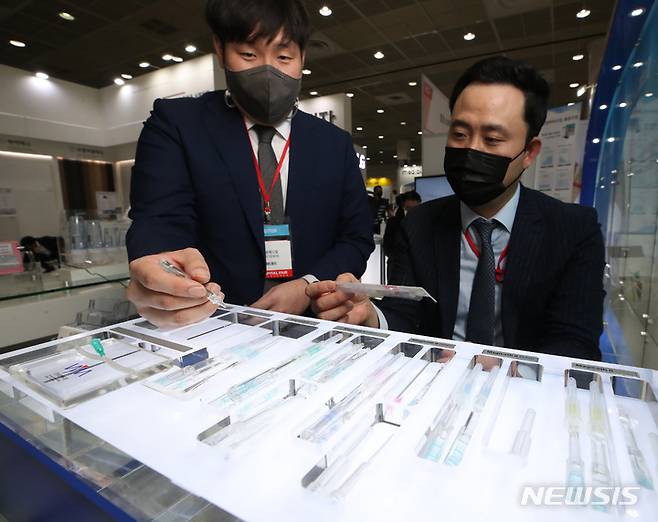 [서울=뉴시스] 조수정 기자 = 30일 서울 삼성동 코엑스에서 개막한 국제 병원 및 의료기기 산업박람회(K-hospital FAIR 2021) 우영메디컬 부스에서 직원이 의료인의 자상 방지 세이프티 카테터를 설명해주고 있다. 2021.09.30. chocrystal@newsis.com
