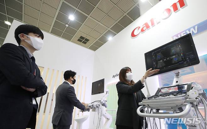 [서울=뉴시스] 조수정 기자 = 30일 서울 삼성동 코엑스에서 개막한 국제 병원 및 의료기기 산업박람회(K-hospital FAIR 2021) 캐논 부스에서 직원이 주력기기인 초음파 영상 진단 기기에 대해 설명해주고 있다. 2021.09.30. chocrystal@newsis.com