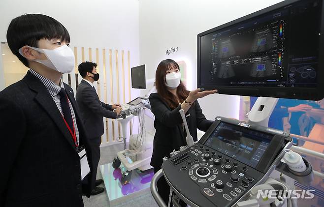 [서울=뉴시스] 조수정 기자 = 30일 서울 삼성동 코엑스에서 개막한 국제 병원 및 의료기기 산업박람회(K-hospital FAIR 2021) 캐논 부스에서 직원이 주력기기인 초음파 영상 진단 기기에 대해 설명해주고 있다. 2021.09.30. chocrystal@newsis.com