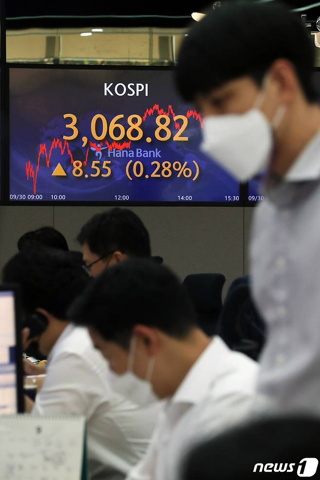(서울=뉴스1) 황기선 기자 = 30일 오후 서울 중구 하나은행 명동점 딜링룸 전광판에 코스피 지수가 전 거래일 대비 8.55포인트(0.28%) 상승한 3068.82를 나타내고 있다.