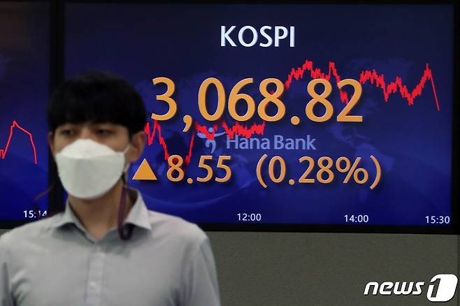 (서울=뉴스1) 황기선 기자 = 30일 오후 서울 중구 하나은행 명동점 딜링룸 전광판에 코스피 지수가 전 거래일 대비 8.55포인트(0.28%) 상승한 3068.82를 나타내고 있다.