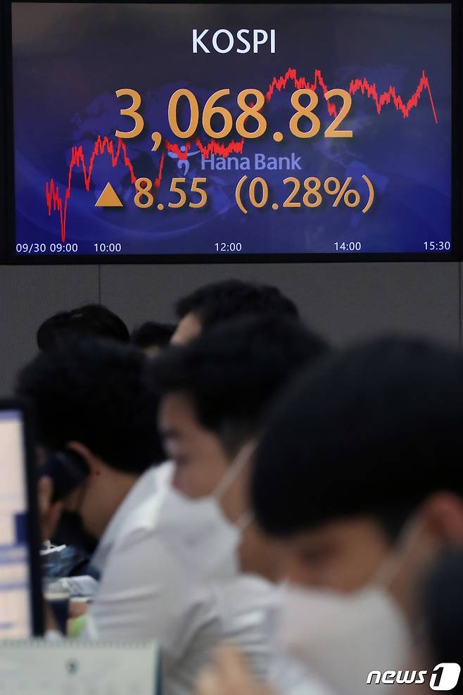 (서울=뉴스1) 황기선 기자 = 30일 오후 서울 중구 하나은행 명동점 딜링룸 전광판에 코스피 지수가 전 거래일 대비 8.55포인트(0.28%) 상승한 3068.82를 나타내고 있다.