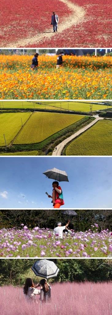 위부터 붉게 물든 인천 강화군 석모도 칠면초가 군락지, 경기 의왕시 왕송호수 인근 황화코스모스, 노랗게 익어가는 시흥시 인근 논, 시흥 갯골생태공원에서 바라본 푸른 하늘, 코스모스, 경기 의왕시 왕송호수 인근 핑크뮬리. 2021.9.30