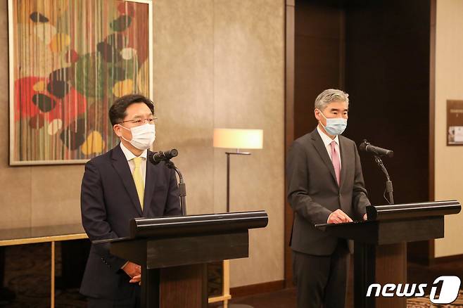 (서울=뉴스1) = 노규덕 한반도평화교섭본부장과 성 김 미국 대북특별대표가 30일 인도네시아 자카르타 페어몬트 호텔에서 한미 북핵 수석대표 협의를 마친 후 발언하고 있다. (외교부 제공) 2021.9.30/뉴스1