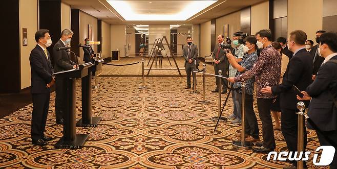 (서울=뉴스1) = 노규덕 한반도평화교섭본부장과 성 김 미국 대북특별대표가 30일 인도네시아 자카르타 페어몬트 호텔에서 한미 북핵 수석대표 협의를 마친 후 발언하고 있다. (외교부 제공) 2021.9.30/뉴스1