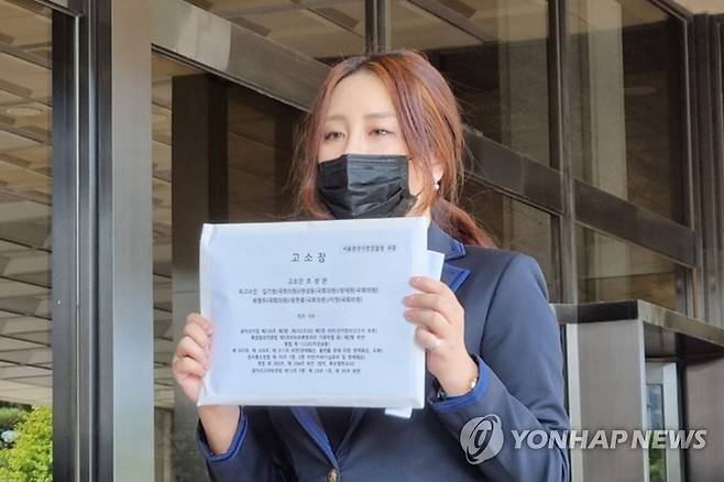 (서울=연합뉴스) 김주환 기자 = 30일 오후 서울중앙지검에 국민의힘 권성동, 김기현, 윤한홍, 이영, 장제원, 최형두 의원을 공직선거법 위반 등의 혐의로 고소한 조성은 씨가 고발장을 들어 보이고 있다. 2021.9.30