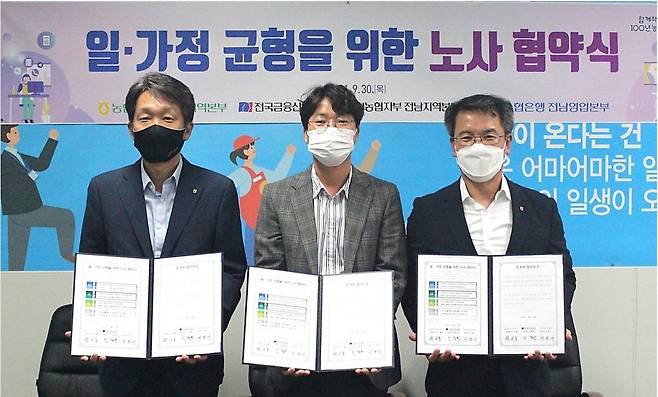 (무안=연합뉴스) 농협전남노조와 농협전남지역본부·전남영업본부가 30일 점포신설·조정이 담긴 일·가정 균형에 관한 협약을 체결했다.