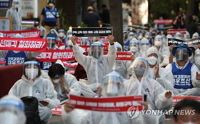 (서울=연합뉴스) 임헌정 기자 = 민주노총 조합원들이 30일 오후 서울 중구 정동 민주노총 앞에서 1020 총파업 전국동시 결의대회를 하며 구호를 외치고 있다. 2021.9.30