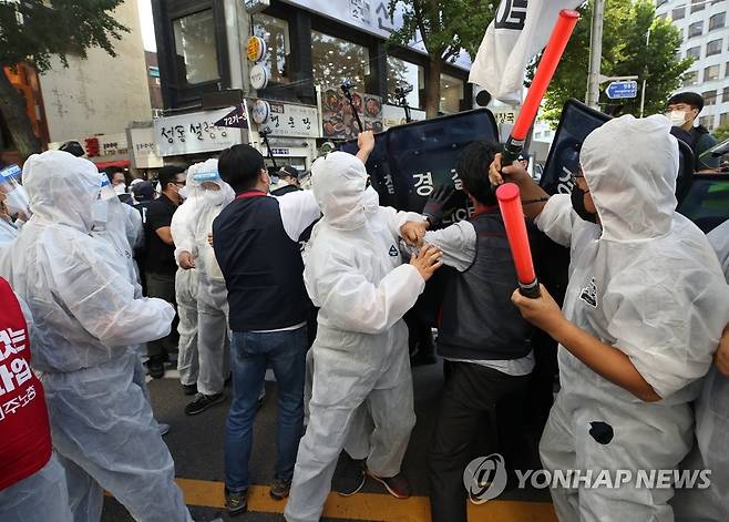 (서울=연합뉴스) 임헌정 기자 = 민주노총 조합원들이 30일 오후 서울 중구 정동 민주노총 앞에서 1020 총파업 전국동시 결의대회에 앞서 이를 막으려는 경찰과 몸싸움을 빚고 있다. 2021.9.30