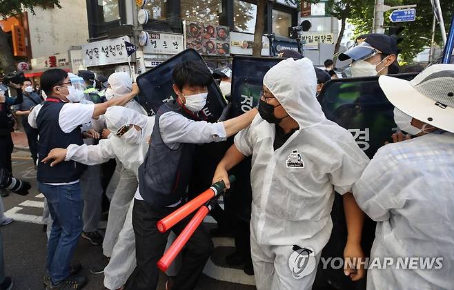 (서울=연합뉴스) 임헌정 기자 = 민주노총 조합원들이 30일 오후 서울 중구 정동 민주노총 앞에서 1020 총파업 전국동시 결의대회에 앞서 이를 막으려는 경찰과 몸싸움을 빚고 있다. 2021.9.30