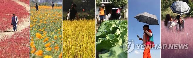 왼쪽부터 붉게 물든 인천 강화군 석모도 칠면초 군락지, 경기 의왕시 왕송호수 인근 황화코스모스, 노랗게 익어가는 시흥시 인근 논, 의왕시의 한 배추농가, 시흥 갯골생태공원에서 바라본 푸른 하늘, 경기 의왕시 왕송호수 인근 핑크뮬리. 2021.9.30