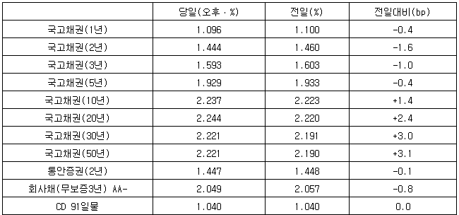 20년물은 연 2.244%로 2.4bp 올랐다. 30년물과 50년물은 각각 3.0bp 상승, 3.1bp 상승으로 연 2.221%, 연 2.221%를 기록했다.