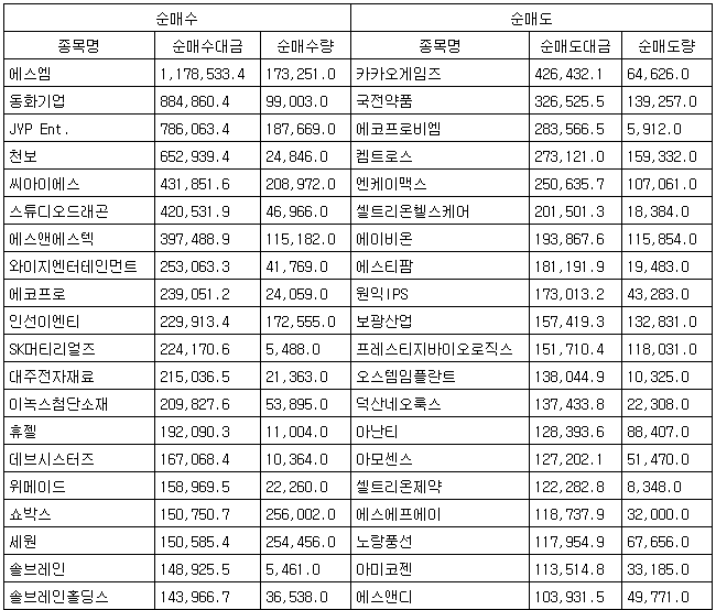 [표] 코스닥 기관 순매수도 상위종목(30일)