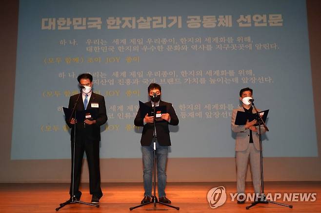 (서울=연합뉴스) 30일 오후 경북 문경문화예술회관 대공연장 1층에서 열린 '제2회 전통한지 유네스코 인류무형문화유산 등재를 위한 학술포럼'에서 참가자들이 대한민국 한지 살리기 공동체 선언문을 발표하고 있다. 2021.9.30