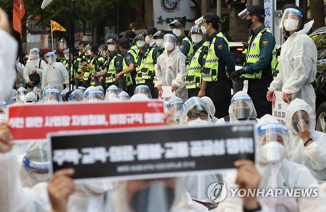 (서울=연합뉴스) 임헌정 기자 = 민주노총 조합원들이 30일 오후 서울 중구 정동 민주노총 앞에서 1020 총파업 전국동시 결의대회를 하며 구호를 외치고 있다. 2021.9.30
