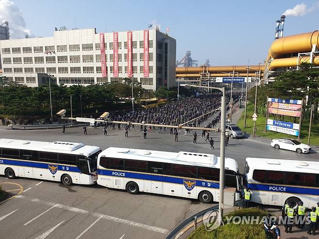 (당진=연합뉴스) 전국 금속노동조합 현대제철 비정규직지회 노조원 등이 30일 오후 현대제철 충남 당진제철소 내 통제센터 앞에서 집회를 열고 자회사 설립 중단과 조합원의 정규직 고용을 촉구하고 있다. 2021.9.30 [독자 제공. 재판매 및 DB 금지]