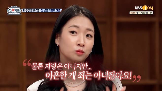 네 살 아이를 혼자 키우고 있는 배수진은 "엄마만 키우고 있으니까 애기가 불안해보인다', '엄마 닮아서 아기도 못생겼네' 라는 악플도 달렸다. 나 때문에 아들이 욕 먹는 것 같아서 더 속상하다. 아들 욕을 하니까 못 참겠더라. 그래서 나왔다. 제 욕했을 때는 참아야지 했는데 가족들 욕을 하니까 못 참겠다 싶었다"고 '실연박물관' 출연 이유를 밝혔다. (사진=KBS Joy '실연박물관' 캡처)