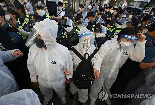 (서울=연합뉴스) 임헌정 기자 = 민주노총 조합원들이 30일 오후 서울 중구 정동 민주노총 앞에서 1020 총파업 전국동시 결의대회에 앞서 이를 막으려는 경찰과 맞서고 있다. 2021.9.30