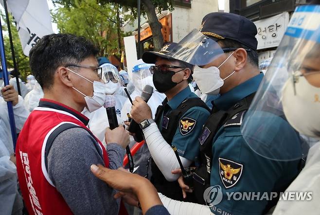 방역복 입고 경찰과 맞선 민주노총