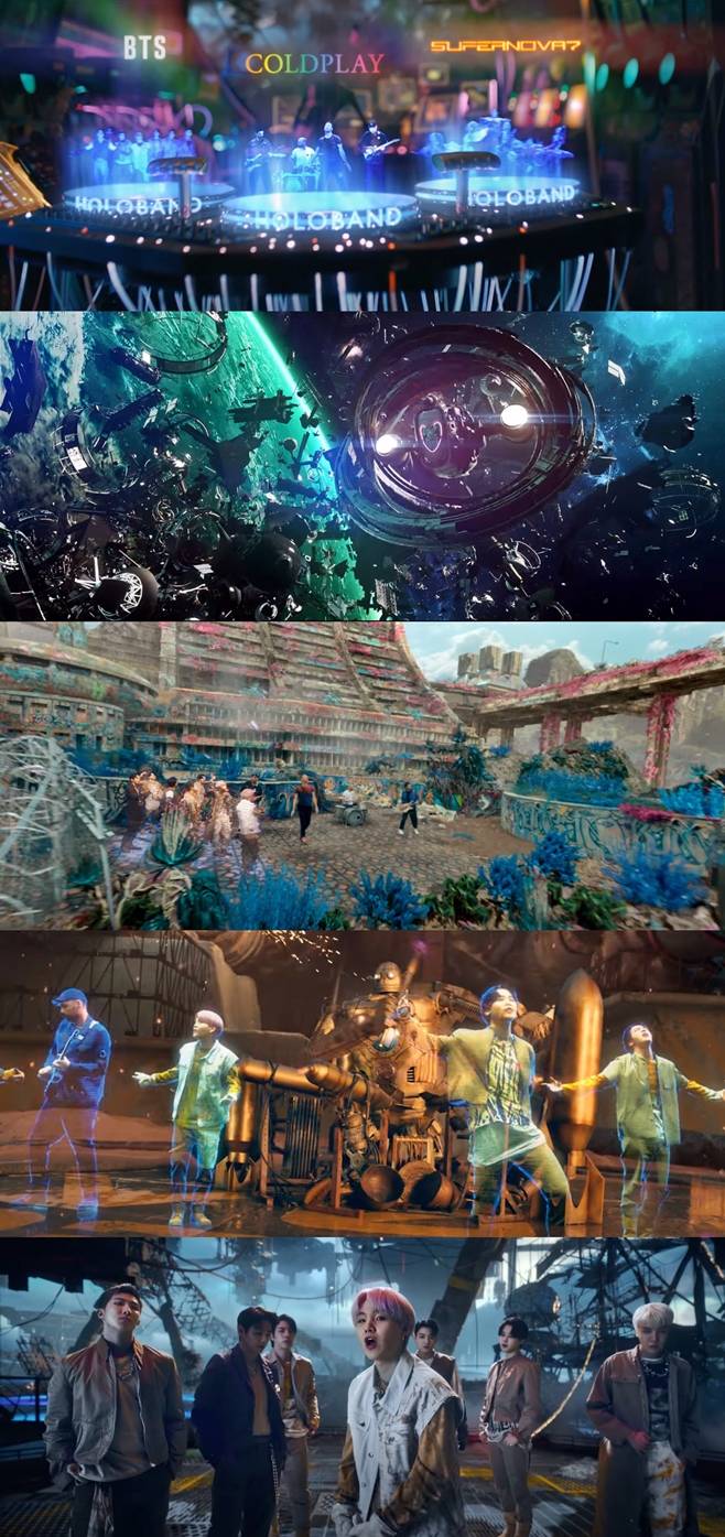 [티브이데일리 황서연 기자] 밴드 콜드플레이와 그룹 방탄소년단(BTS, RM 진 슈가 제이홉 지민 뷔 정국)가 컬래버레이션한 '마이 유니버스(My Universe)' 뮤직비디오가 높은 완성도로 화제를 모으고 있다.