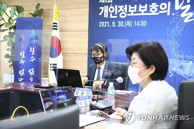 (서울=연합뉴스) 윤종인 개인정보보호위원장이 30일 오후 비대면 메타버스 방식으로 개최된 '제1회 개인정보보호의 날 행사'에 참석해 인사말을 하고 있다. 2021.9.30