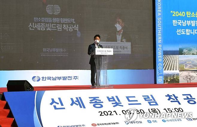 (서울=연합뉴스) 박기영 산업통상자원부 2차관이 30일 세종시 신세종빛드림건설본부 건설 현장에서 열린 '신세종빛드림 착공식'에 참석해 축사하고 있다. 2021.9.30