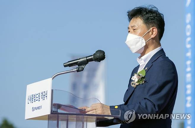 (서울=연합뉴스) 박기영 산업통상자원부 2차관이 30일 세종시 신세종빛드림건설본부 건설 현장에서 열린 '신세종빛드림 착공식'에 참석해 축사하고 있다. 2021.9.30
