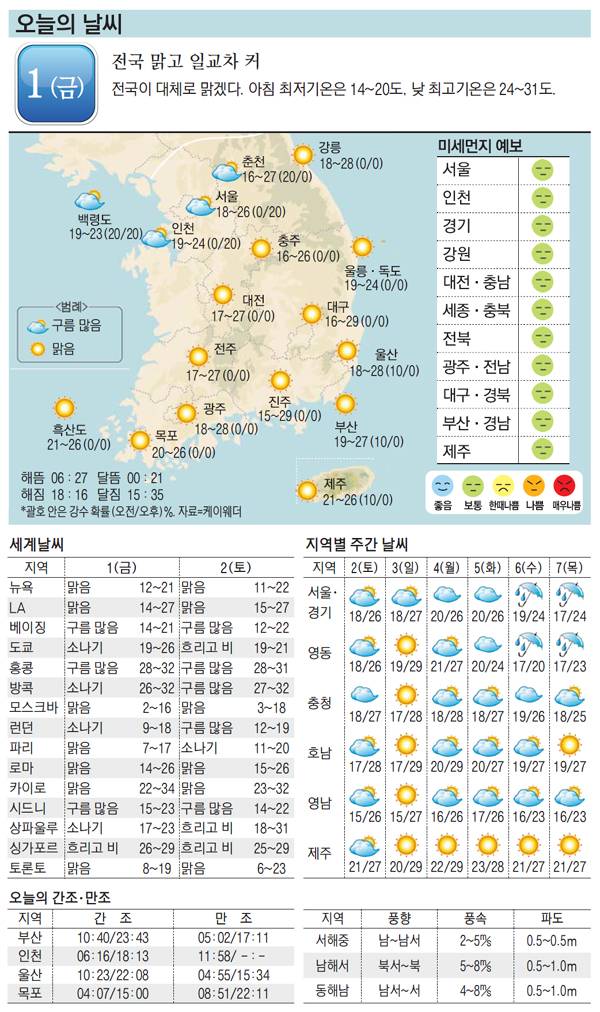 [오늘의 날씨] 1일, 전국 맑고 일교차 커