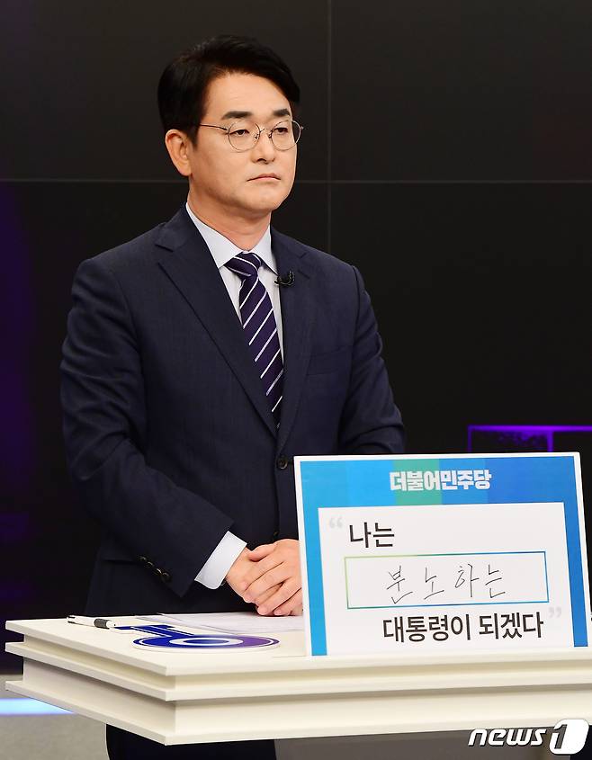 (서울=뉴스1) 국회사진취재단 = 박용진 더불어민주당 대선 예비후보가 30일 서울 중구 TV조선에서 열린 방송토론회를 준비하고 있다. 2021.9.30/뉴스1
