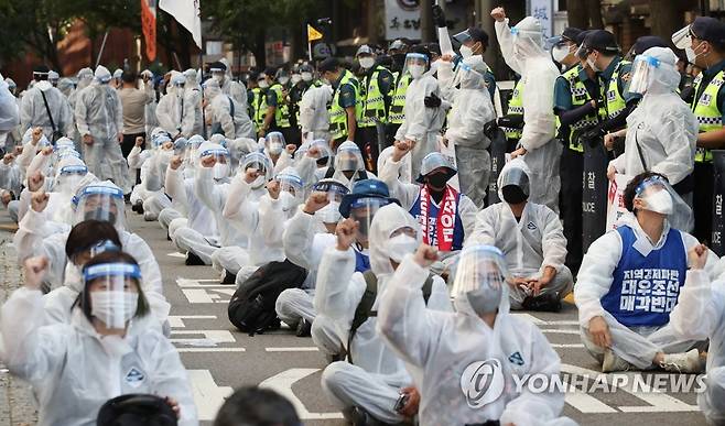 (서울=연합뉴스) 임헌정 기자 = 민주노총 조합원들이 30일 오후 서울 중구 정동 민주노총 앞에서 1020 총파업 전국 동시 결의대회를 하고 있다. 2021.9.30