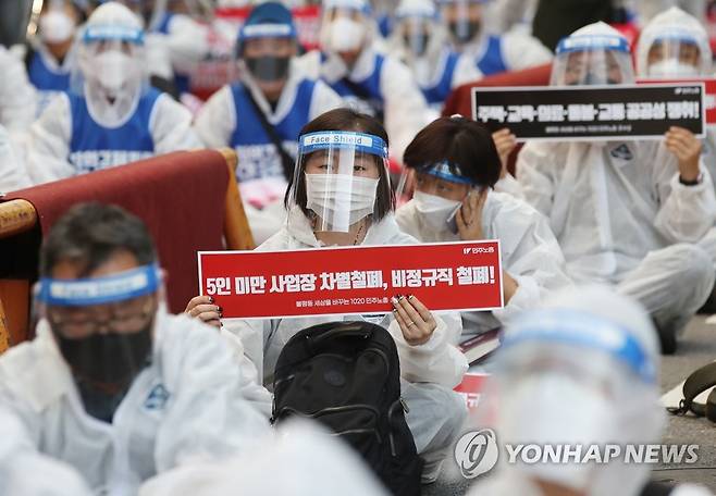 (서울=연합뉴스) 임헌정 기자 = 민주노총 조합원들이 30일 오후 서울 중구 정동 민주노총 앞에서 1020 총파업 전국 동시 결의대회를 하고 있다. 2021.9.30