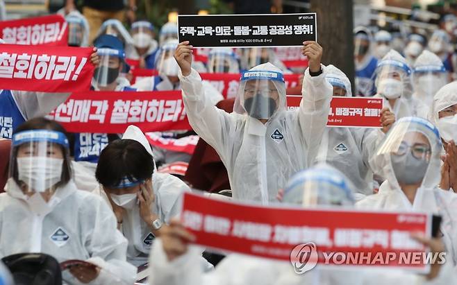 (서울=연합뉴스) 임헌정 기자 = 민주노총 조합원들이 30일 오후 서울 중구 정동 민주노총 앞에서 1020 총파업 전국 동시 결의대회를 하고 있다. 2021.9.30