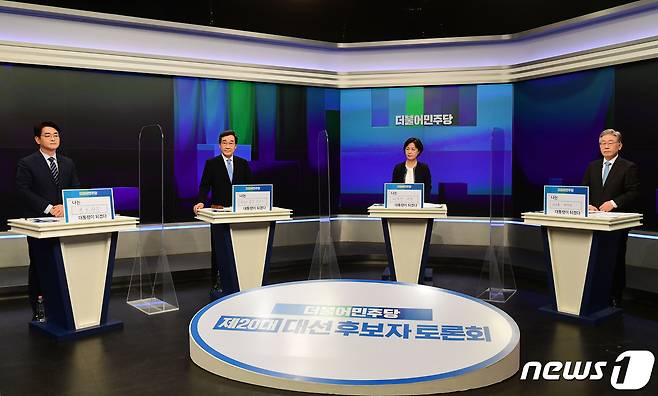(서울=뉴스1) 국회사진취재단 = 더불어민주당 대선 예비후보들이 30일 오후 서울 중구 TV조선에서 열린 방송토론회를 준비하고 있다. 왼쪽부터 박용진, 이낙연, 추미애, 이재명 후보. 2021.9.30/뉴스1