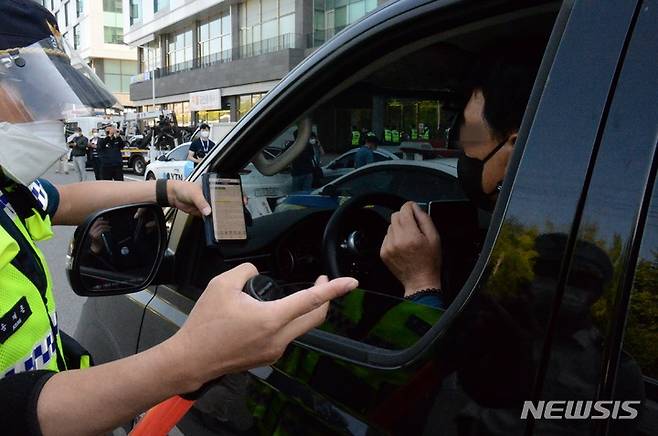 [청주=뉴시스] 조성현 기자 = 30일 오후 방역당국의 집합금지 행정명령도 무시한 채 충북 청주시 흥덕구 SPC삼립 청주공장 인근에서 열린 민주노총 공공운수노조 결의대회에 참석한 조합원 한 명이 경찰의 제지에 반발하고 있다. 2021.09.30. jsh0128@newsisc.om