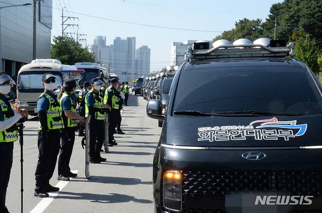 [청주=뉴시스] 조성현 기자 = 30일 오후 충북 청주시 흥덕구 SPC삼립 청주공장 인근 도로변으로 민주노총 공공운수노조 화물연대 조합원들이 모이고 있다. 방역당국인 청주시는 지난 28일 오후 8시를 기점 화물연대에 한해 청주 전역에 집합금지 행정명령을 내렸다. 화물연대 측은 집합금지 행정명령을 무시한 채 이날 1000여명 이상이 모여 결의대회를 열었다. 2021.09.30. jsh0128@newsisc.om