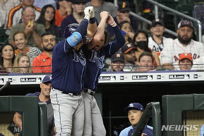 [휴스턴=AP/뉴시스] 탬파베이 레이스의 최지만(왼쪽)이 29일(현지시간) 미 텍사스주 휴스턴의 미닛메이드파크에서 열린 2021 메이저리그(MLB) 휴스턴 애스트로스와의 경기 5회 3점 홈런을 치고 들어와 동료 브렛 필립스와 기쁨을 나누고 있다. 최지만은 빅리그 데뷔 후 통산 50홈런 고지를 밟았다. 2021.09.30.