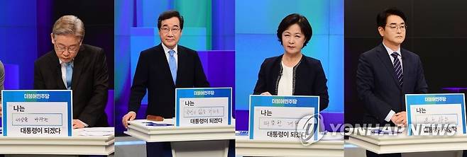 (서울=연합뉴스) 더불어민주당 대권주자들이 30일 서울 중구 TV조선에서 열린 방송토론회에서 각각 자신의 대통령에 대한 구상을 내세우고 있다.