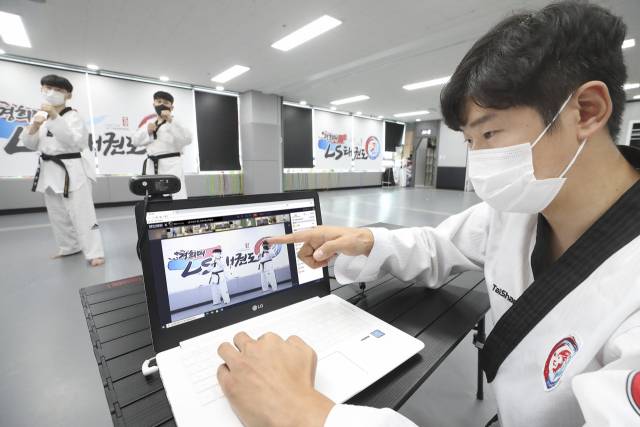 30일 경기도 용인 소재 한 태권도 학원에서 ‘KT 랜선에듀’를 이용해 태권도 교습이 진행되고 있다. KT는 이날 KT 랜선에듀 서비스 범위를 기존 입시·보습학원에서 예체능·기업·협회 교육 현장으로 확대하고, 에듀테크 기업들과 협력해 서비스 품질을 높이겠다고 밝혔다. /사진 제공=KT