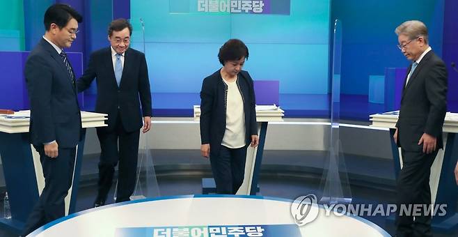 (서울=연합뉴스) 더불어민주당 대권주자인 이재명 경기지사(오른쪽 부터), 추미애 전 법무부 장관, 이낙연 전 대표, 박용진 의원이 30일 서울 중구 TV조선에서 방송토론을 준비하고 있다. 2021.9.30 [국회사진기자단]