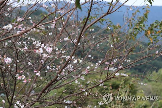 (구례=연합뉴스) 전남 구례군이 운영하는 구례수목원에 아름다운 가을 벚꽃이 개화했다. 사진은 지난 28일 수목원에 활짝 핀 가을 벚꽃으로, 가을 벚나무는 봄과 가을에 꽃을 볼 수 있어 춘추벚나무라고도 불린다. 2021.9.30 [구례군 제공. 재판매 및 DB 금지]