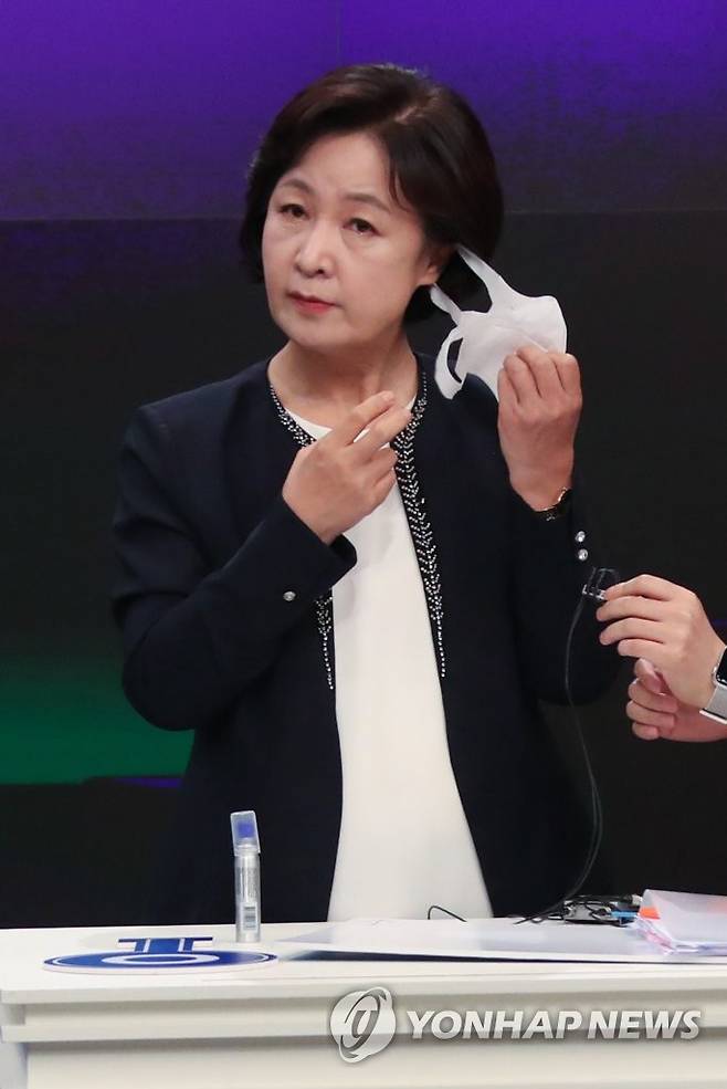 (서울=연합뉴스) 더불어민주당 대권주자인 추미애 전 법무부 장관이 30일 서울 중구 TV조선에서 방송토론을 준비하고 있다. 2021.9.30 [국회사진기자단]