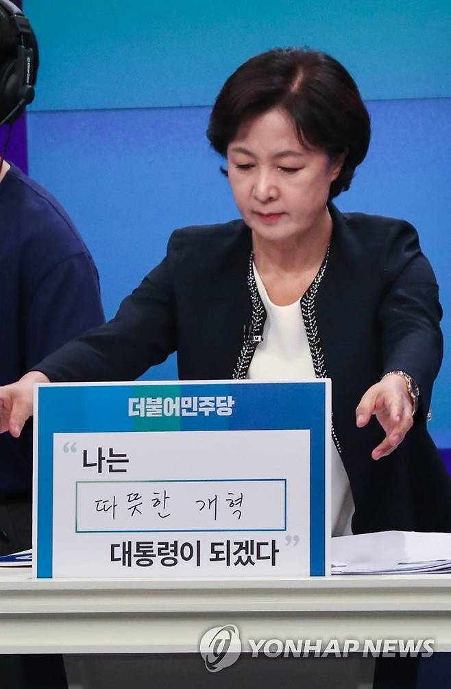 (서울=연합뉴스) 더불어민주당 대권주자인 추미애 전 법무부 장관이 30일 서울 중구 TV조선에서 열린 방송토론회에서 "나는 '따뜻한 개혁' 대통령이 되겠다" 를 내세우고 있다. 2021.9.30 [국회사진기자단]