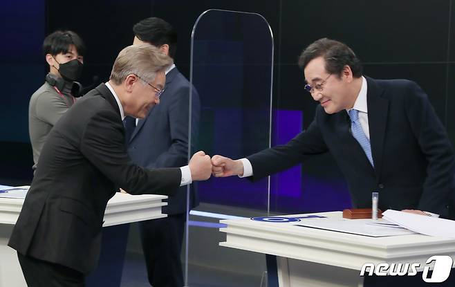 (서울=뉴스1) 국회사진취재단 = 더불어민주당 이재명, 이낙연 대선 예비후보가 30일 서울 중구 TV조선에서 열린 방송토론회를 앞두고 인사를 나누고 있다. 2021.9.30/뉴스1