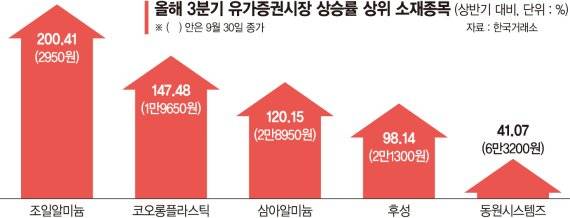 알루미늄 기반 기업뿐 아니라 대형 플라스틱, 불소화학물 등 소재기업 역시 큰 폭의 주가 상승을 꾀하며 3·4분기 유가증권시장을 주도했다.