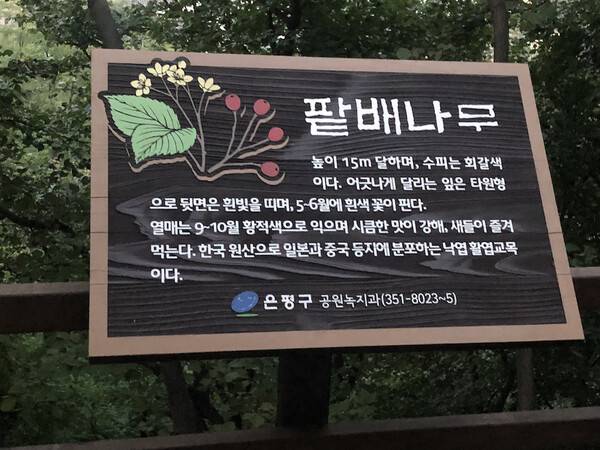 봉산에서 빼놓을 수 없는 게 바로 팥배나무다. 늦봄에 배꽃 같은 하얀 꽃이 피고 가을에는 열매가 붉은 팥알 같이 열린다. 봉산 팥배나무숲은 서울지역에서 찾아보기 힘든 대규모 팥배군락지로 희귀성이 높다고 한다.
