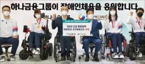 하나금융그룹이 대한장애인체육회와 함께 서울 명동 사옥 1층에서 ‘도쿄 패럴림픽 특별전시’를 10월 말까지 연다. 함영주 하나금융 부회장(왼쪽 네 번째), 정진완 대한장애인체육회장(세 번째)은 보치아 금메달리스트인 최예진 선수(두 번째)와 정호원 선수(여섯 번째), 탁구 은메달리스트 서수연 선수에게 격려금과 광고 모델 사진 액자를 전달했다.