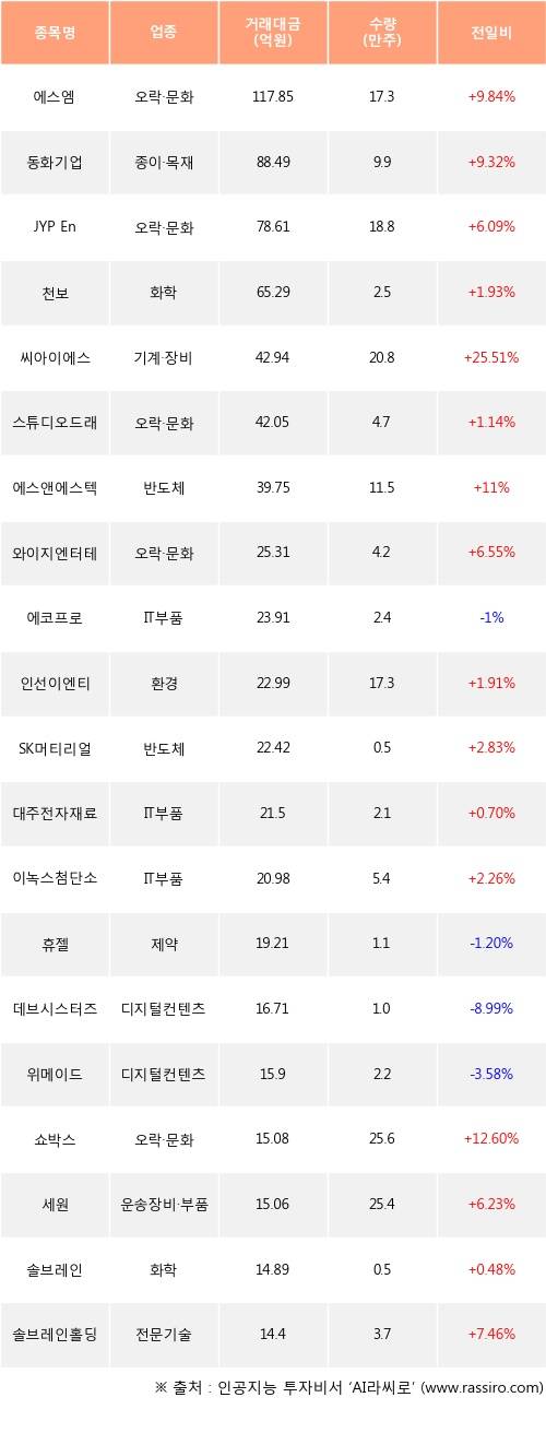 30일, 기관 코스닥에서 에스엠(+9.84%), 동화기업(+9.32%) 등 순매수