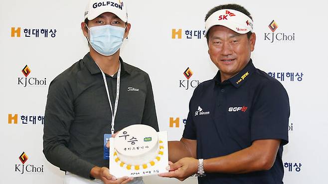 한국프로골프, KPGA 코리안투어 '현대해상 최경주 인비테이셔널' 1라운드를 마치고 주최자 최경주가 경기도 여주의 페럼클럽 미디어센터에 들어서자 본격적인 기자회견 시작에 앞서 한 선수가 손에 떡 케이크를 든 채 미디어센터에 나타났습니다.