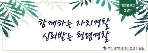 부산시(시장 박형준)는 최근 부산시와 부산경찰청 직원을 대상으로 자치경찰 청렴 슬로건(표어) 공모전을 열고 최우수상에 '함께하는 자치경찰, 신뢰받는 청렴경찰' 등 총 5건을 최종 선정했다고 9월 30일 밝혔다.